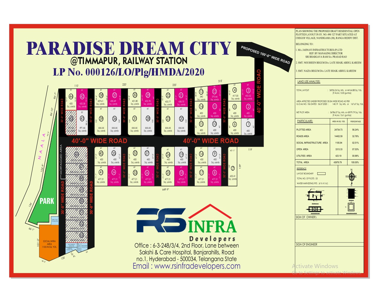 PARADISE DREAM CITY (9.5 acres) is a screne well-laid residental venture sitvated in Timmapur,Shamshabad, Hyderabad. It is a HMDA approved plot established by RS Infra Developers. Situated in a place with necessary utilities, it also offers these well-planned houses and creating great neighbour-hood, plots at cost-efficient prices
